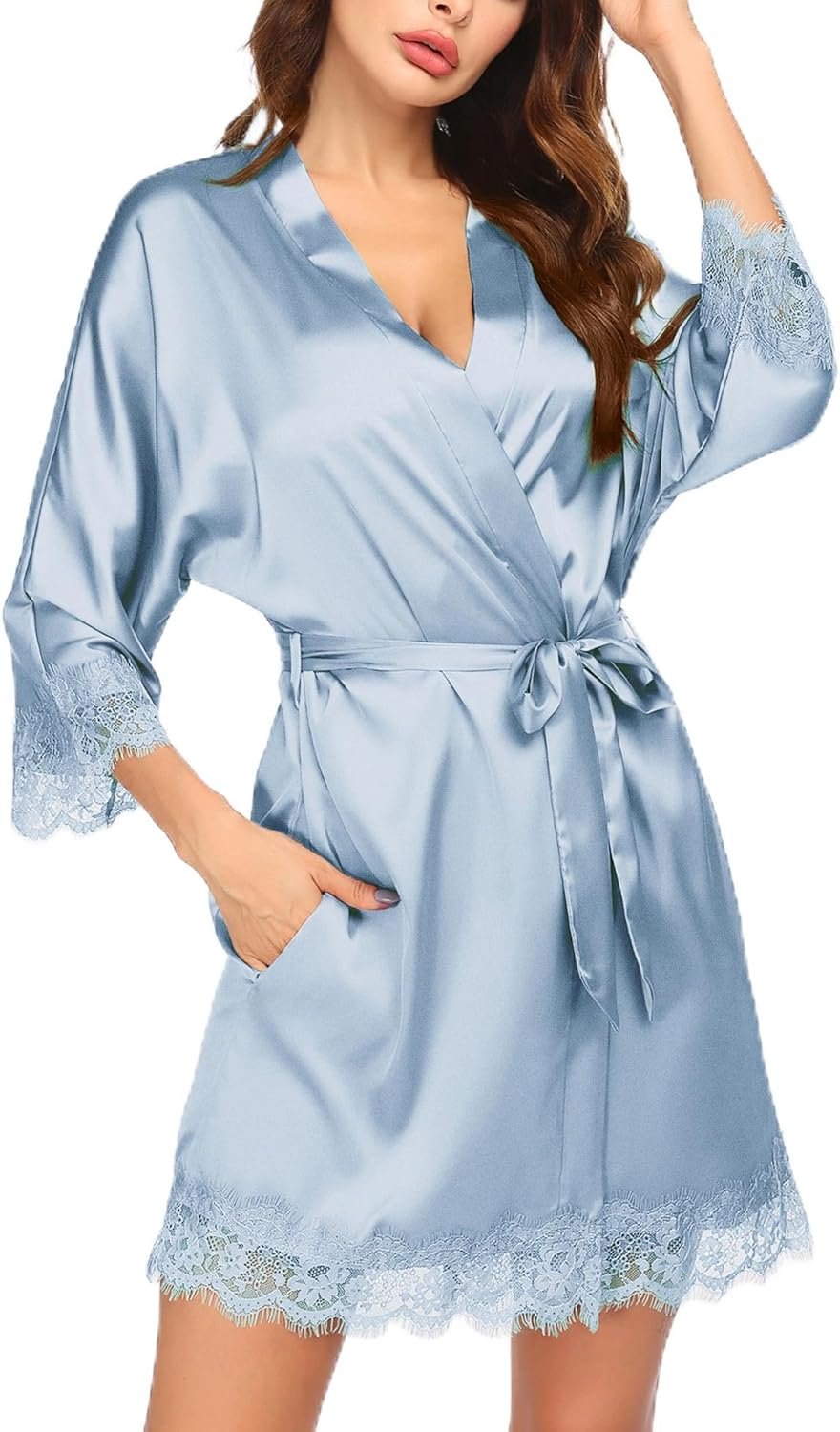 Womens Silk Robe Short Lace Trim Satin Robe 3/4 Sleeve Sexy Kimono Bride Bathrobe Comfy Sleepwear with Pockets