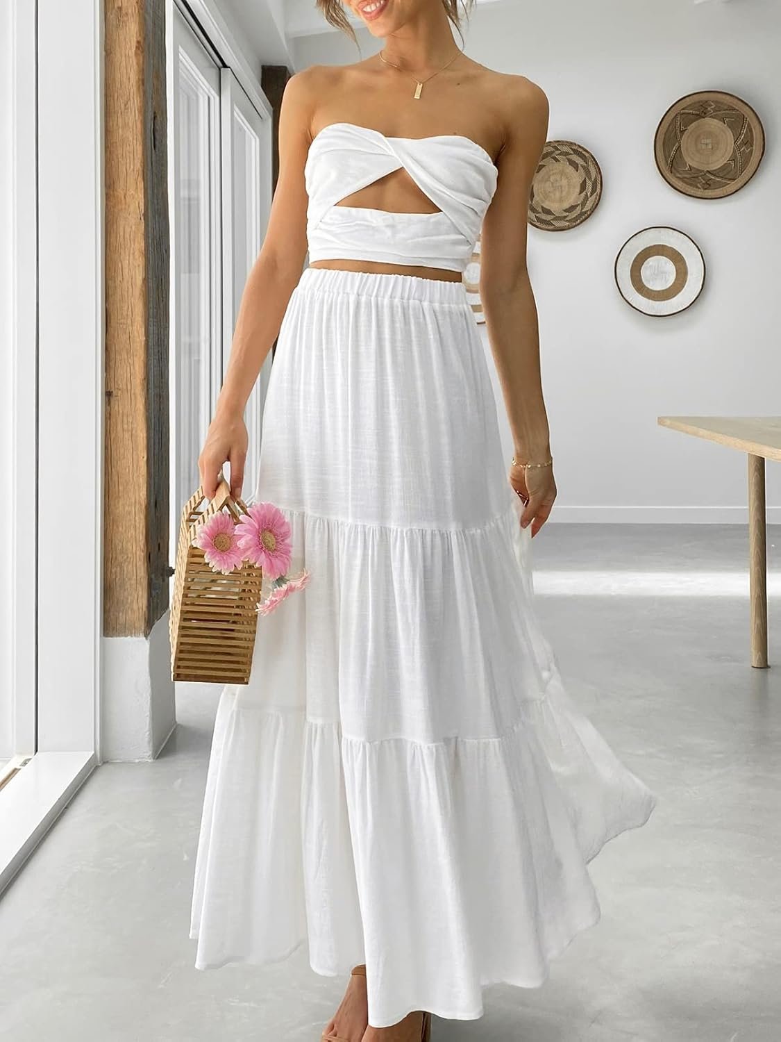 Women’s Summer Flowy Swing Tiered A-Line Maxi Skirt Fashion Trendy Elastic Waist Pleated Long Beach Dress